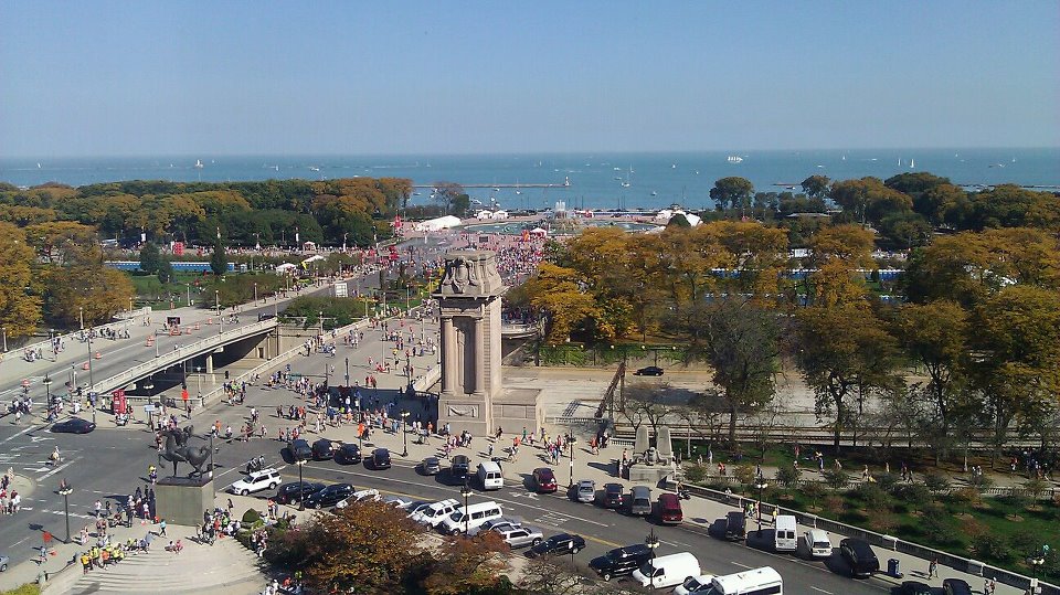 View from the Congress Plaza hotel overlooking Grant Park and Lake Michigan after the 2011 Chicago Marathon.